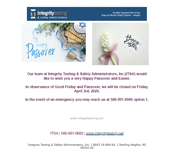 Holiday HoursLeslie BeeryMarch 30, 2026News Holiday hours! ITSA will be closed on Friday, April 3rd, 2026 for observance of Good Friday and Passover.